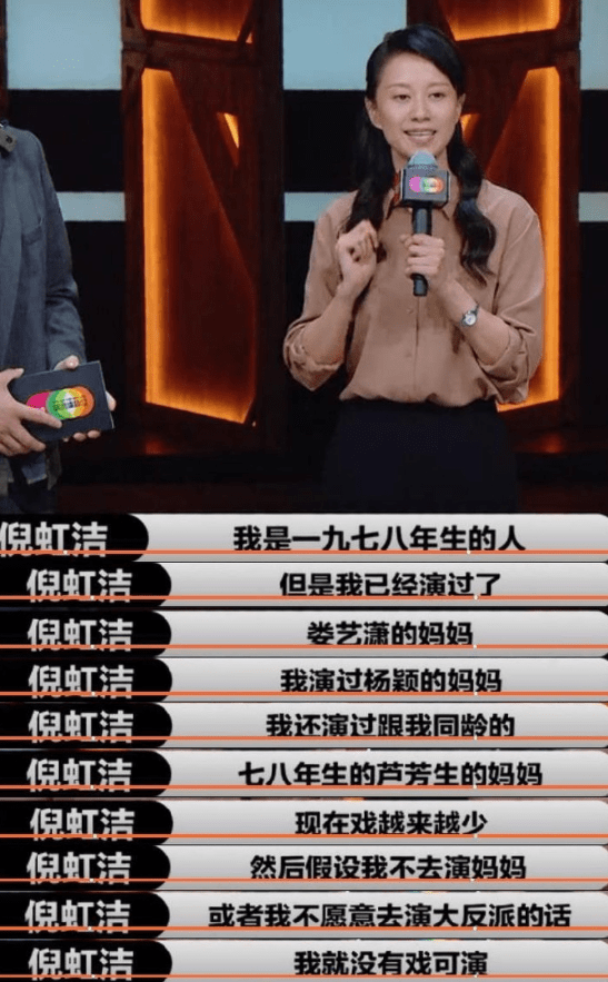 在节目中,倪虹洁颇为哀怨地说,迄今为止,她演过娄艺潇的妈妈,baby(杨颖)的妈妈,甚至演过跟她同龄的芦芳生的妈妈,而如果她不演妈妈,不演反派配角,就没有戏可演。