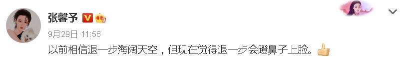 9月29日,她又在社交平台内突然发文称:"以前相信退一步海阔天空,但现在觉得退一步会蹬鼻子上脸。"疑似对某件事不满。