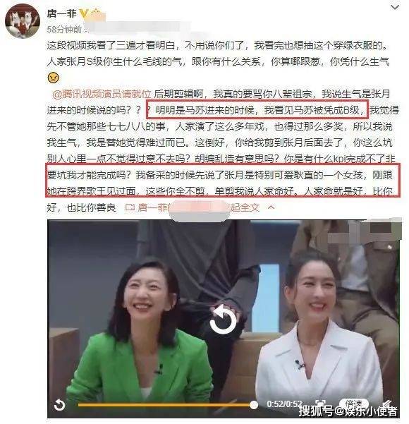 在最新一期的《演员请就位》当中,唐一菲因为被评为B级而愤愤不平,并向自己的同伴马苏抱怨了起来。。看到这样的情况之后,粉丝们纷纷不淡定了,认为唐一菲就是在为自己的不红找借口。而唐一菲也发布了一篇微博,声称是节目组乱剪辑造成的,不免让人感觉唐一菲有甩锅的嫌疑。看得出来,目前的唐一菲已经是泥菩萨过河,自身难保了。