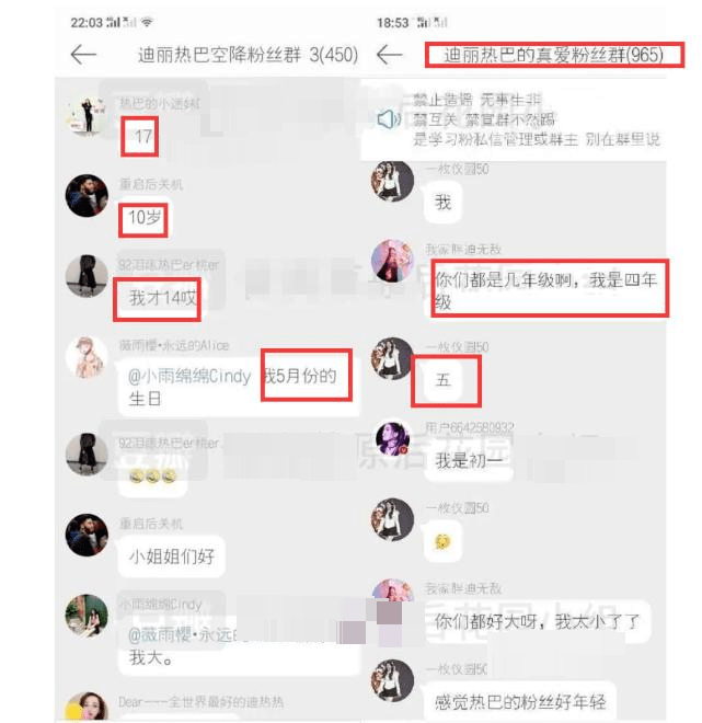 与此同时,有网友提供了迪丽热巴粉丝群里的聊天记录,粉丝们都在贴心地互相询问对方年龄,结果冒泡的几乎清一色都是低龄粉,还在读小学的粉丝不在少数,年纪稍微大一点的也就17岁,还是一个未成年。