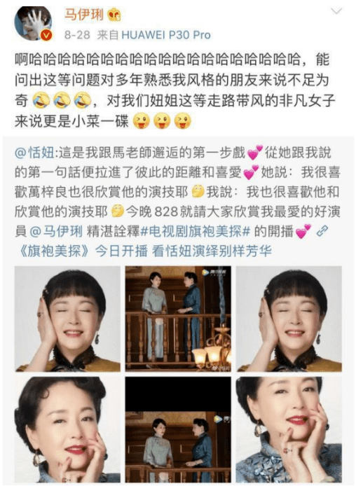 恬妞在剧中饰演的是马伊琍的姨妈,两个人戏里戏外都有着年龄辈分的差距,但两个人看来感情非常好,在社交平台上恬妞和马伊琍也是经常互动,宛若一对十分亲密的忘年交。