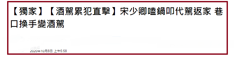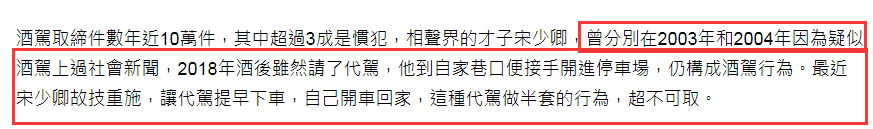 然而这样的事情对于宋少卿来说也并非是第一次,台湾媒体报道中指出,宋少卿分别在2003年、2004年被曝出过酒驾,同时还有2018年时也有酒驾,并且当时的行为与此次被拍到的画面一样,都是找代驾开导巷子口。
