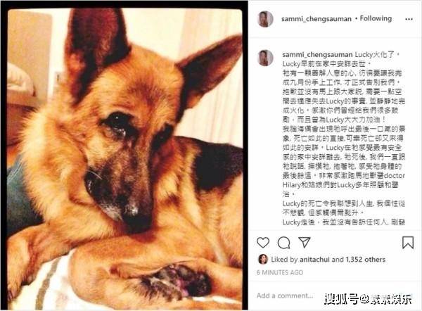许志安与妻子一起发文悼念爱犬,用6个字“我爱你,多谢你”感谢Lucky对妻子和自己家庭的陪伴,而郑秀文则用近2000字的长文来回忆爱犬Lucky,流露出自己对它不舍的心情。