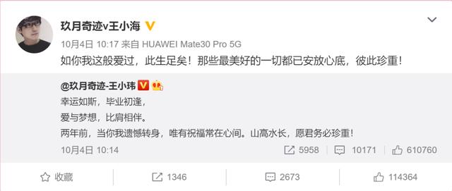 就在王小玮本人发布了这条消息之后,三分钟之后男方王小海转发了这条动态,并表示“如你我这般爱过,此生足矣!那些最美好的一切都已安放心底,彼此珍重!”,进一步证实了两人离婚的消息。