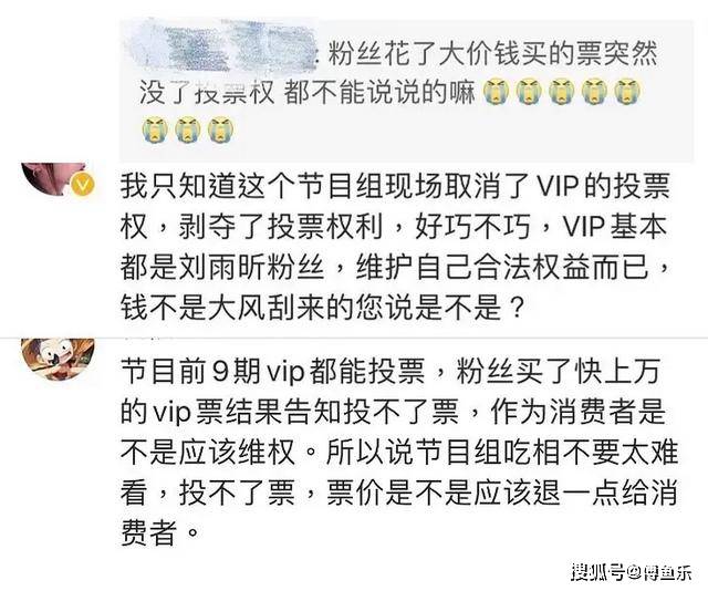 但是随后,一些知情人向八卦媒体爆料称,刘雨昕的粉丝们听信了黄牛的话,黄牛称VIP票能够投票,于是粉丝们花了大价钱购买了VIP票,想要为刘雨昕投票。谁知道有的人一张票花了几千块钱,到了现场却发现VIP票并不能投票。但是具体这个VIP票能不能投票,看来是粉丝和节目组的矛盾了,毕竟如果这个VIP票不能投票,黄牛也并不会瞎说。如果从侧面来讲,也许这可能是节目组坑了粉丝一把。