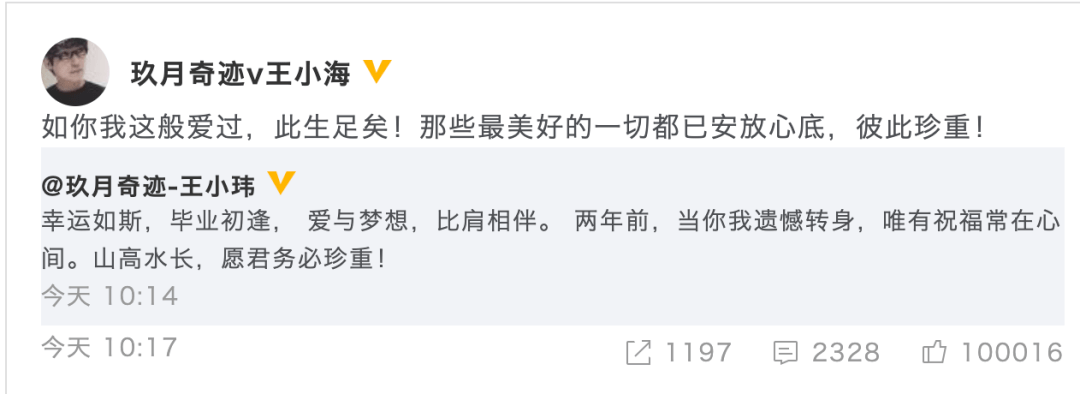 4日,玖月奇迹王小玮发文宣布两年前已和王小海离婚,“两年前,当你我遗憾转身,唯有祝福常在心间。山高水长,愿君务必珍重”。