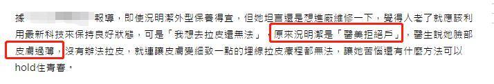 据台媒报道,况明洁曾在接受采访时,谈起保养一事时还自曝自己是"医美拒绝户",虽然她自己认为应该利用最新的科技来保持良好的状态,但无奈医生说她的皮肤过薄,就连让皮肤紧致一点的拉皮疗程况明洁都无法做,这让她十分苦恼。