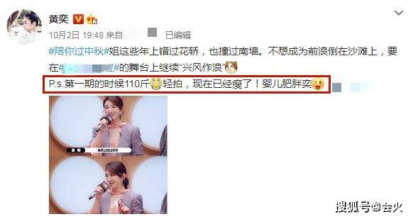 10月2日,演员黄奕在其社交平台上发文,称自己在参加某档真人秀综艺节目时,体重狂飙,曾一度胖到110斤。从黄奕晒出的两张微胖时期照片来看,那个时候的她,的确看起来十分圆润,脸部丰满有肉感。