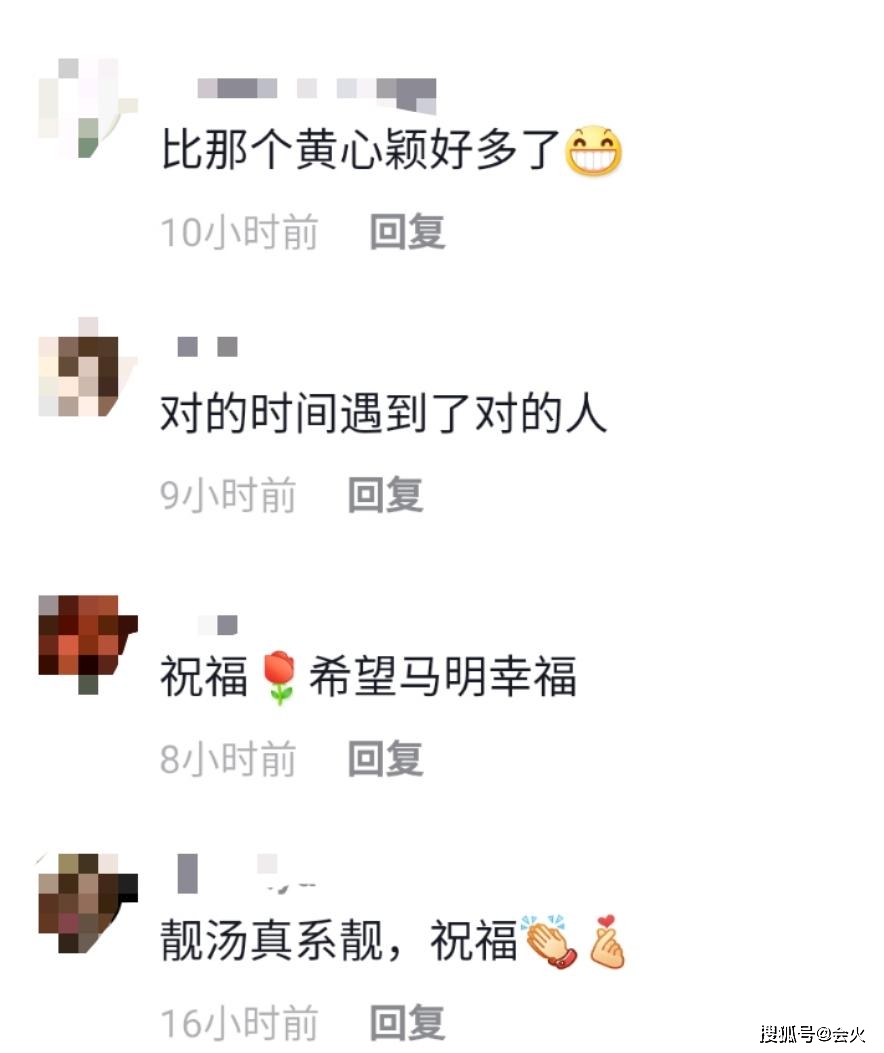 消息一出,马国明与汤洛雯受到很多人的祝福。有网友评价两人的爱情是:对的时间遇到对的人,也有一些网友提到了马国明的前女友黄心颖。