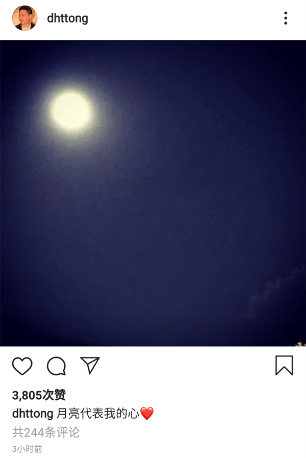 10月3日凌晨,唐鹤德晒出一张月亮的照片,配文道:“月亮代表我的心”,还加上了一颗心,借此回应传闻。