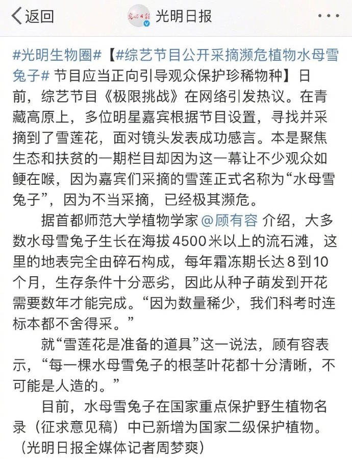但在节目播出之后,有网友认出刘宇宁采摘的是国家二级珍惜物种水母雪兔子,随后此事迅速引起热议,不仅促使多方植物相关学者发文指责,包括光明日报也采访的植物学家并点名批评,西藏自治区林业和草原局更是表示关注到了东方卫视《极限挑战》嘉宾采摘西藏珍稀植物相关情况,并表态已介入调查。