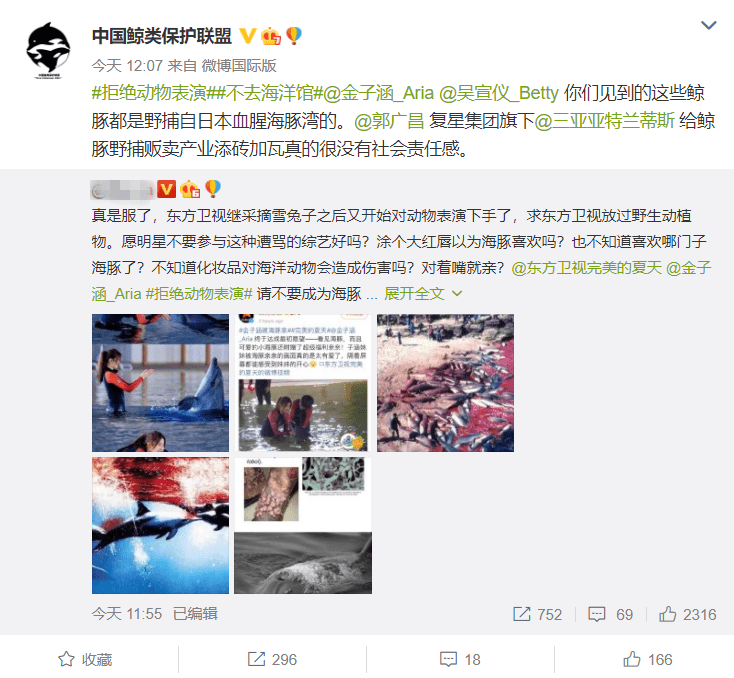随后,“中国鲸类保护联盟”官微再次发文,并直接点名吴宣仪与金子涵两位女星,向两人喊话称“你们见到的这些鲸豚都是野捕自日本血腥海豚湾的”,并且,官微还大骂当地的海洋馆缺乏社会责任感,言语之中尽显愤慨。