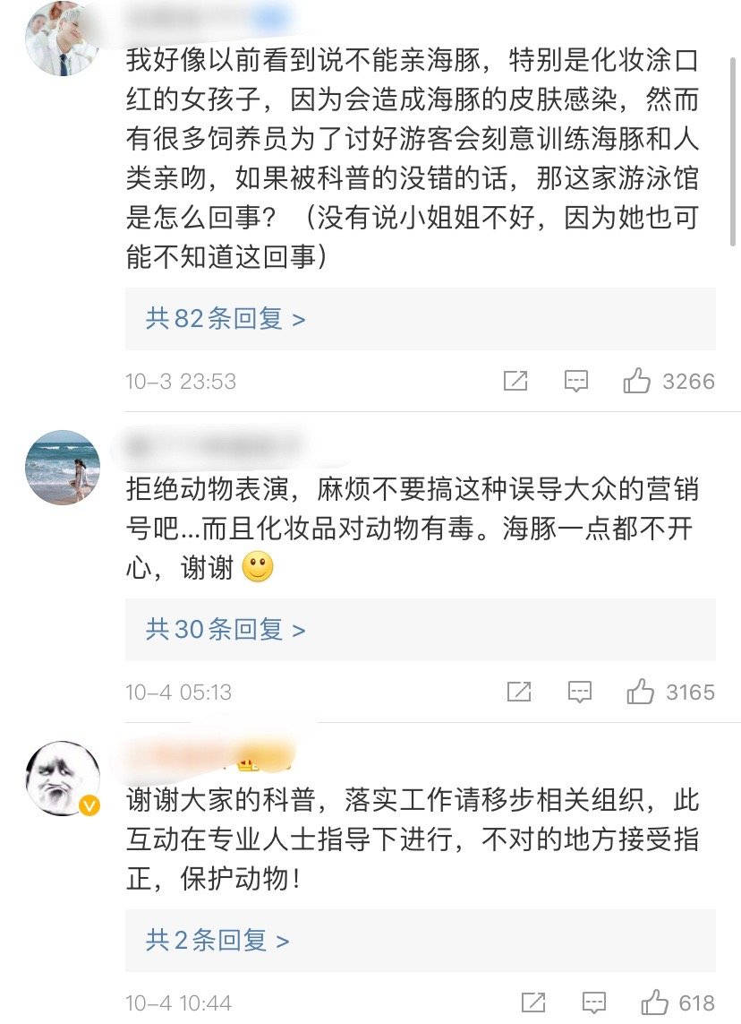 而此事之所以会引起不满,首先是海豚表演一直是明令禁止的,在观赏野生动物的一些基本原则中就有不投喂动物、不触碰动物、拒绝动物表演以及不圈养鲸豚,包括海水饲养等相关内容,此外,网友也科普称,带妆涂口红是不能亲吻海豚的,因为化妆品对海豚来说是有毒的,口红也会造成海豚的皮肤感染等。