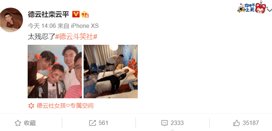 两张照片里,栾云平的配文是:太残忍了!确实,第一张就是王九龙脸被当成了画布,身边是围观的秦霄贤,烧饼和栾云平自己。第二张更惨:躺着床上满脸被画得面目全非,烧饼居然还站在床上围观拍照!妥妥的变成看热闹不嫌事大的吃瓜群众,不过王九龙应该是被栾云平连累,评论区还在抱怨:没有您我死的没有那么惨!