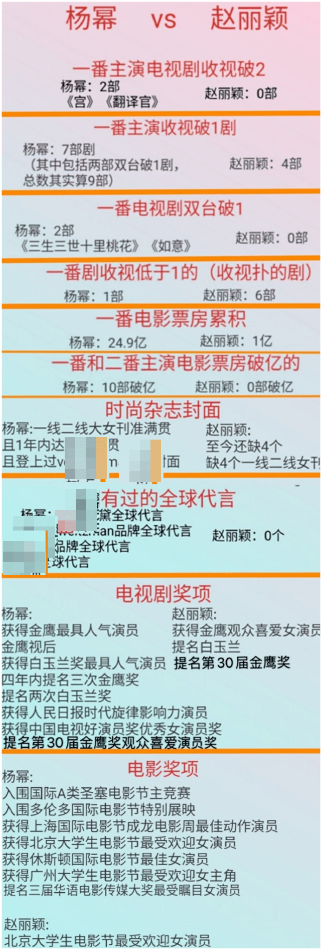 10月4日,有吃瓜群众发现杨幂粉丝和赵丽颖粉丝又撕起来了,原因也是网友们已经看腻了的“比实绩”。不同于以往两家粉丝因自我吹嘘引起的骂战,这次赵丽颖造型师的加入直接让两家粉丝的骂战进入了白热化阶段。杨幂和赵丽颖谁的实绩最强?这个问题好像已经成了“月经贴”,每到一段时间就会被网友讨论一次。为了看得更加直观清晰,有网友也专门做了两人的实绩统计图一探究竟。