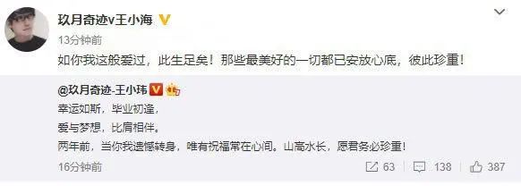 作为男主角,王小玮的前夫兼工作伙伴王小海也发了分手微博以示回应。两条微博时间前后仅差3分钟,显然是早有准备。