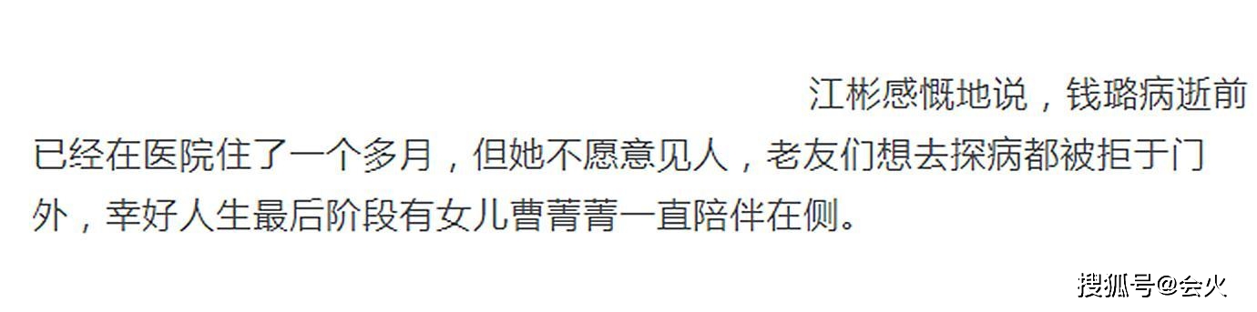 据悉,钱璐在9月时就住进了医院,但是家人考虑钱璐年事已高,她自己也不愿意见人,就并没有公开病情。在院期间,钱璐一直十分低调接受医院治疗,就连老友想要探望都拒之门外,是女儿曹菁菁陪伴她走完了最后一程。