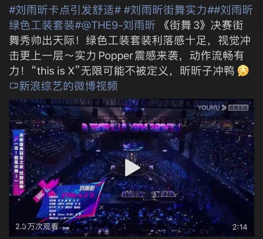 街舞今天总决赛邀请了刘雨昕,是因为之前刘雨昕参加过街舞节目,而且还因为舞蹈能力让很多街舞圈的人对她有所改观,当时她就已经小小的出过圈了。这次回来,算是被街舞节目借了一个热度,但她也是真的很喜欢跳舞,所以节目组对接的时候271那边没有压的意思,她就立马答应了。