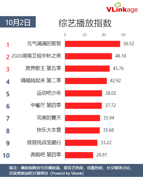 【综艺榜单】10月2日当日#综艺播放指数#:1.#元气满满的哥哥# 播放指数 56.52 2.#2020湖南卫视中秋之夜# 3.#跨界歌王 第五季# 4.#嗨唱转起来 第二季# 5.#运动吧少年# 6.#中餐厅 第四季# 7.#完美的夏天# 8.#快乐大本营# 9.#极限挑战宝藏行# 10.#奔跑吧 第四季#
