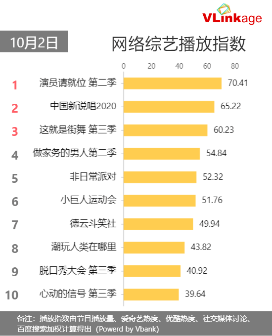 【网综榜单】10月2日当日#网络综艺播放指数#:1.#演员请就位 第二季# 播放指数 70.41 2.#中国新说唱2020# 3.#这就是街舞 第三季# 4.#做家务的男人第二季# 5.#非日常派对# 6.#小巨人运动会# 7.#德云斗笑社# 8.#潮玩人类在哪里# 9.#脱口秀大会 第三季# 10.#心动的信号 第三季#