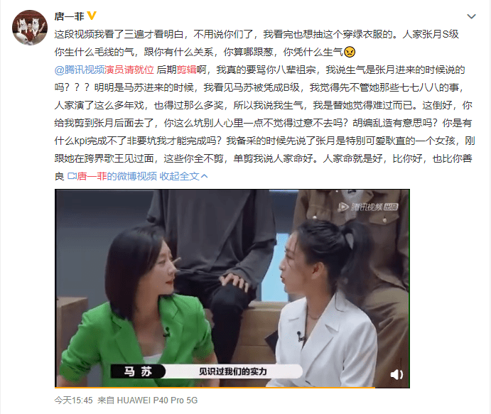 唐一菲怼节目组这段我说实话,我觉得她戏有点多,我们一点一点来看,首先是她自述的这段话,她说她表达自己生气的时候,并不是在张月被评为S级的时候,而是在马苏被评为B级的时候,所以她很生气,结果被节目组剪成了因为张月得S而生气。