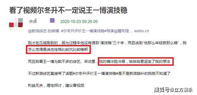 按照部分网友的观点,尔冬升本来评价的就不是王一博的演技,这个热搜略显猴急了。而"冷眼大侠"看似也不是什么好词,似乎是在形容一个人面瘫。毕竟尔冬升导演是那么犀利的一个人,相信即便面对王一博这种顶流,他也应该不会轻易低头。