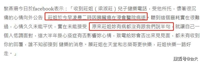 梁淑庄去世不久,黎燕珊在社交账号上对外界公布了这个消息,她表示,自己接到梁淑庄儿子的电话后,才知晓此事,心情久久不能平复。好友黎燕珊坦言自己也是后来才知道梁淑庄患病,梁淑庄之前没有说出过半句关于生病的事,她一直都是一个人低调面对病痛。
