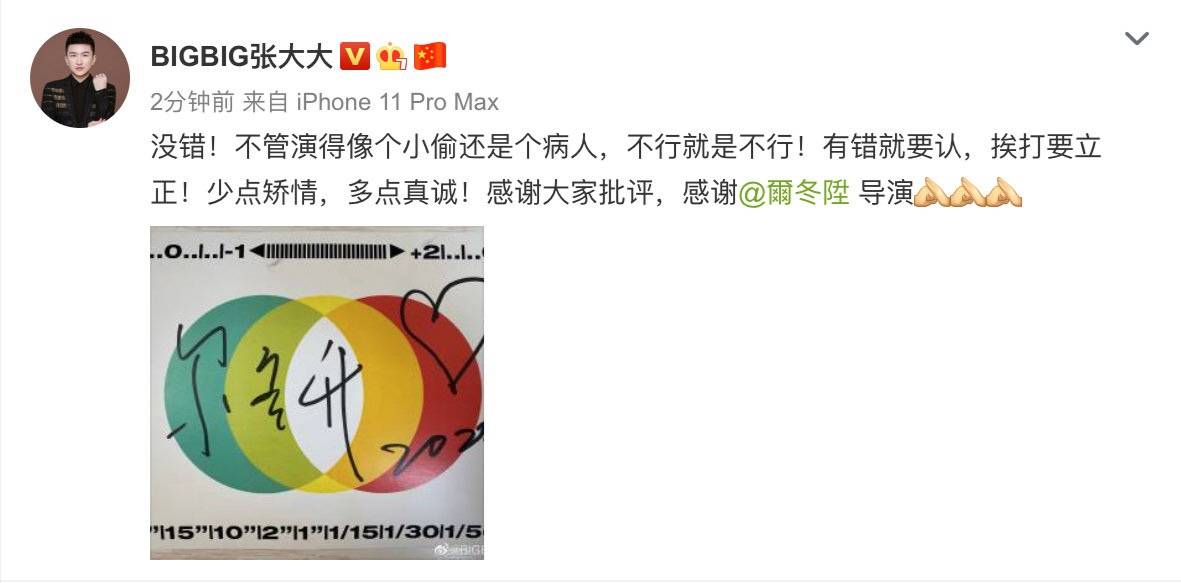 可能是许多网友的评论太过犀利,今早,张大大又发微博回应尔导在节目中的点评,表示:“没错!不管演得像个小偷还是个病人,不行就是不行!有错就要认,挨打要立正!少点矫情,多点真诚!感谢大家批评”,终于大方承认自己演技的不足,同时也感谢了尔冬升导演对自己的批评和指导。