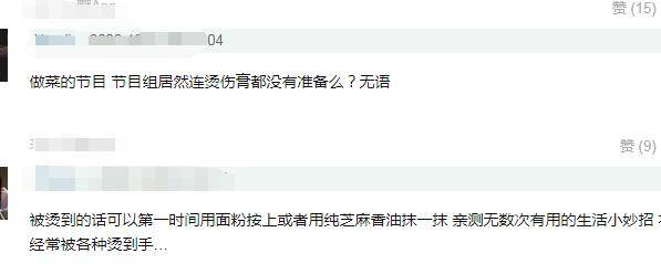 按常理来说,做饭节目,流血、烫伤等都很寻常,节目组为了保障艺人安全,准备一些预防药膏是基本要求。希望下一回节目组再仔细一点吧!