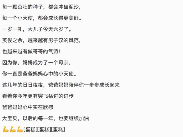 在文案中,杜星霖感谢孩子让自己成为一个母亲。她说:爸爸妈妈陪伴着你成长,今年更有突飞猛进的进步,欣慰之余并祝愿以后的每一年,都要继续加油。