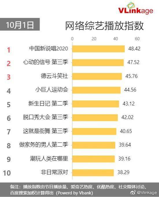 【网综榜单】10月1日当日#网络综艺播放指数#:1.#中国新说唱2020# 播放指数 48.42 2.#心动的信号 第三季# 3.#德云斗笑社# 4.#小巨人运动会# 5.#新生日记 第二季# 6.#脱口秀大会 第三季# 7.#这就是街舞 第三季# 8.#做家务的男人第二季# 9.#潮玩人类在哪里# 10.#非日常派对#