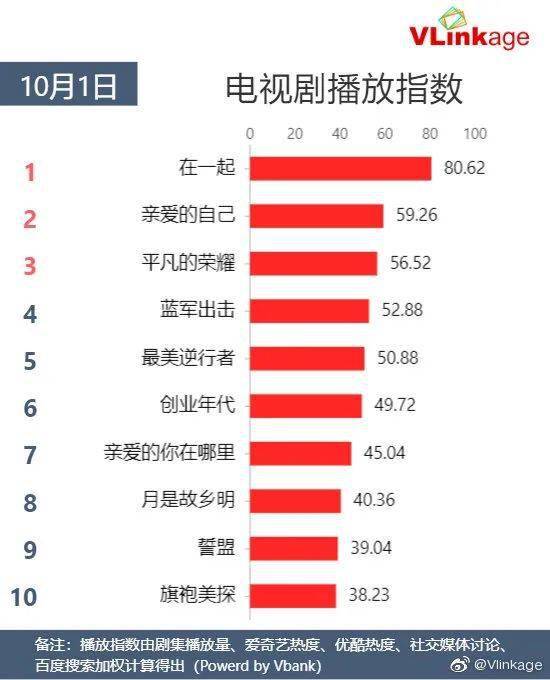【纬岭榜单】10月1日当日#电视剧播放指数#:1.#在一起# 播放指数 80.62 2.#亲爱的自己# 3.#平凡的荣耀# 4.#蓝军出击# 5.#最美逆行者# 6.#创业年代# 7.#亲爱的你在哪里# 8.#月是故乡明# 9.#誓盟# 10.#旗袍美探#