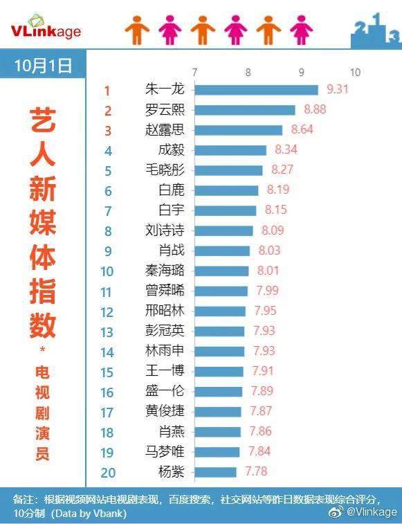 【寻艺指数】10月1日 #艺人新媒体指数# (电视剧演员)Top 20榜单:#朱一龙#,#罗云熙#,#赵露思#,排名前3位, #成毅#,#毛晓彤#,#白鹿#,分列4、5、6位。