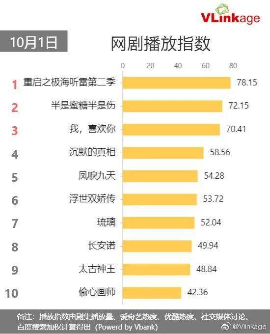 【网络剧榜单】10月1日当日#网剧播放指数#:1.#重启之极海听雷第二季# 播放指数 78.15 2.#半是蜜糖半是伤# 3.#我,喜欢你# 4.#沉默的真相# 5.#凤唳九天# 6.#浮世双娇传# 7.#琉璃# 8.#长安诺# 9.#太古神王# 10.#偷心画师#