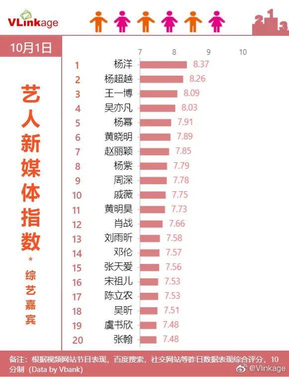 【寻艺指数】10月1日 #艺人新媒体指数# (综艺嘉宾)Top 20榜单:#杨洋#,#杨超越#,#王一博#,排名前3位, #吴亦凡#,#杨幂#,#黄晓明#,分列4、5、6位。