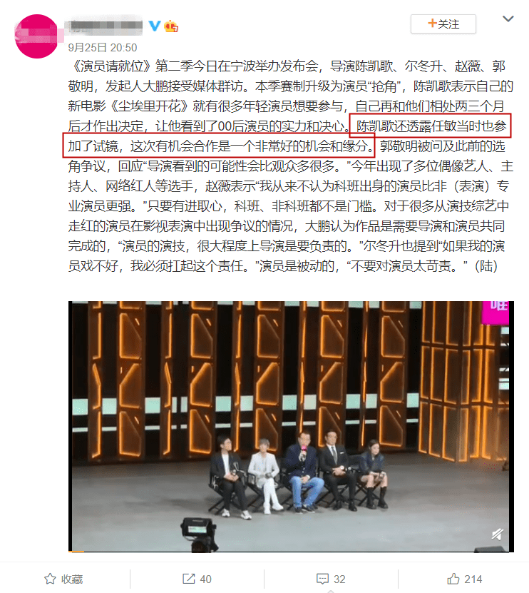 那么,既然任敏在当时无法达到陈凯歌的心理水准,为何陈凯歌这次又当众给出S卡保送任敏晋级呢?这两件事重叠在一起,无论怎么解释都有点过于自相矛盾了,故此,网友也是大胆猜测,任敏参加《演员请就位2》,背后的资本或许起到了很大的推力。