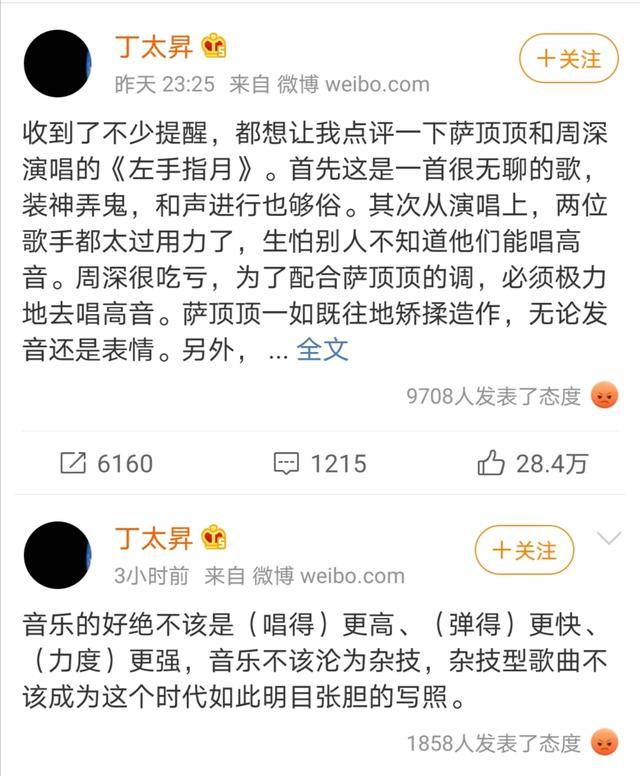 在昨天央视举办的中秋晚会上邀请到了周深以及萨顶顶一起合作在去年非常火的一首歌曲《左手指月》,周深这样的神仙嗓音再加上萨顶顶非常有辨识度的空灵的嗓音,两个人加起来也为这一首歌曲加成不少,这一首歌曲也获得了非常多人的喜爱在今天的网易云热歌榜上也有上榜,但是在前一段时间被李佳航吐槽的"乐评混子"丁太昇也再一次在自己的微博上发表了自己对于这一个歌曲的看法。