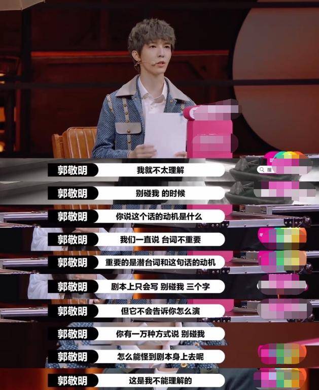 郭敬明注重细节,也指出了陈宥维颤抖着手的生硬,以及王楚然前一秒问相不相信,后一秒说别碰我的逻辑错乱问题。甚至当场贡献了三种状态“别碰我”的戏,别说,还真比许多演员厉害。