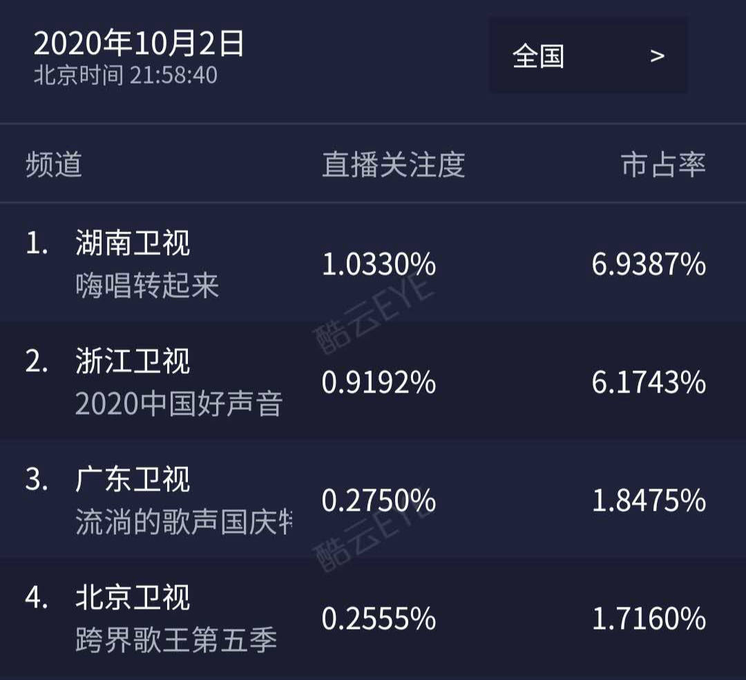 当晚九点半前后,其它卫视已经结束了电视剧的播放,并且进入到了综艺时间。而周五晚间,歌曲类的综艺节目当中,浙江卫视有《中国好声音》,北京卫视有《跨界歌王》。这些歌曲综艺都是比较能打的。不过,在《嗨唱转起来》的播出时间段内,湖南卫视一直比浙江卫视更强悍一些,持续坐在收视率第一的位置上。