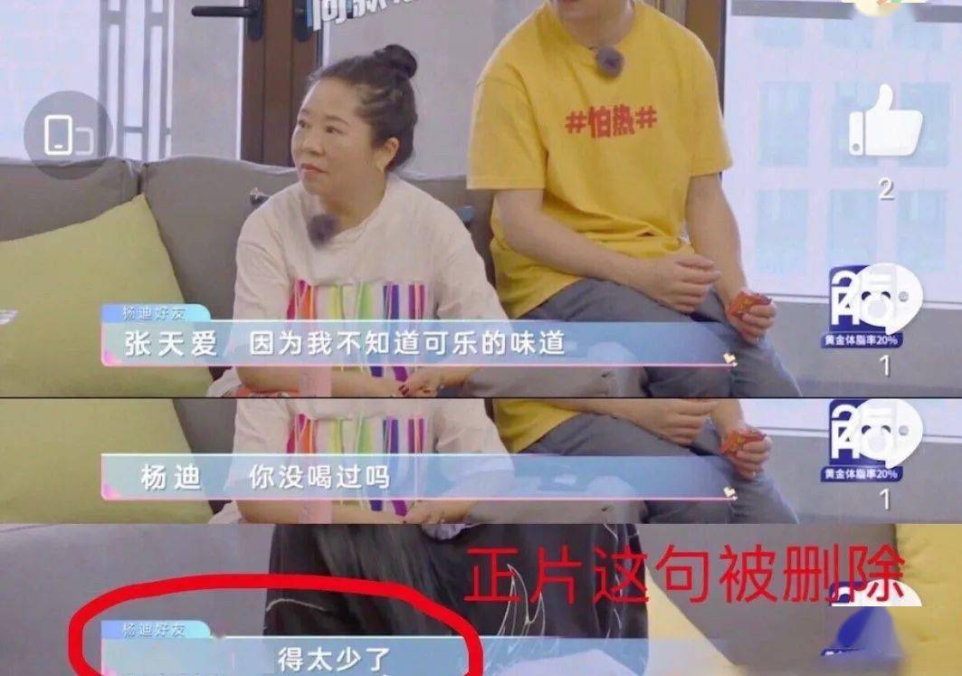 综艺哎呀好身材里张天爱遭恶意剪辑在她当嘉宾时,面对杨迪的询问,张天爱很少喝可乐镜头播出被剪辑成“从来没喝过可乐”。