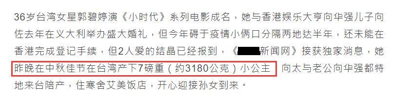 10月2日,有港媒曝光郭碧婷在10月1日便生下小公主一枚,孩子重达7磅(约3180克)。
