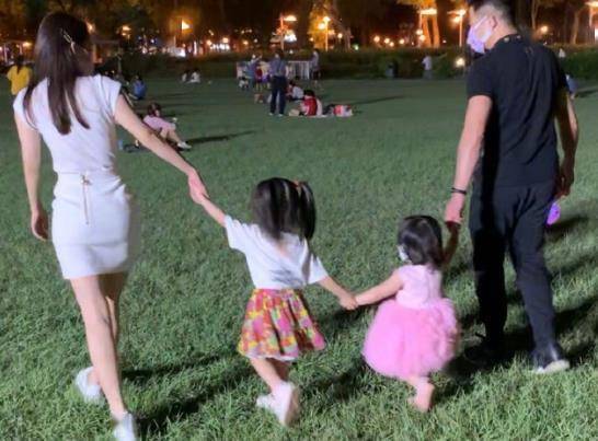 图片中,郭富城和方媛一人牵着一个女儿,一家四口大手拉小手,悠闲地在草地上散步。