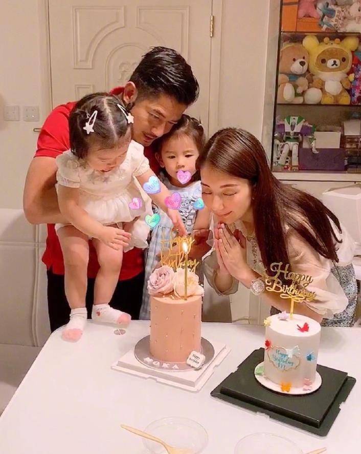郭富城一只手抱着小女儿,一只手搂着大女儿,方媛微笑地低头许愿,心情非常不错。