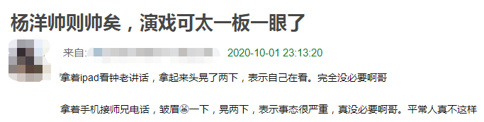 有网友直接指出,杨洋的脸是帅的,但是演技太过“一板一眼”,比较刻意。所以在网友看来,他太“端着”,“脸部表情太空”,有用力过猛的嫌疑。