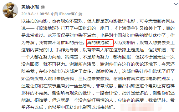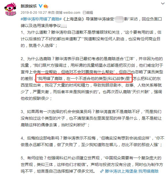 当年《上海堡垒》上映后差评如潮,票房和口碑双崩。有网友犀利评价:“《流浪地球》打开了中国科幻的一扇门,《上海堡垒》又给关上了。”作为导演的滕华涛也公开致歉。毕竟也是曾经执导过《蜗居》、《王贵与安娜》、《失恋三十三天》这种优秀佳作的,却因《上海堡垒》遭遇滑铁卢,想必滕华涛也是始料未及。