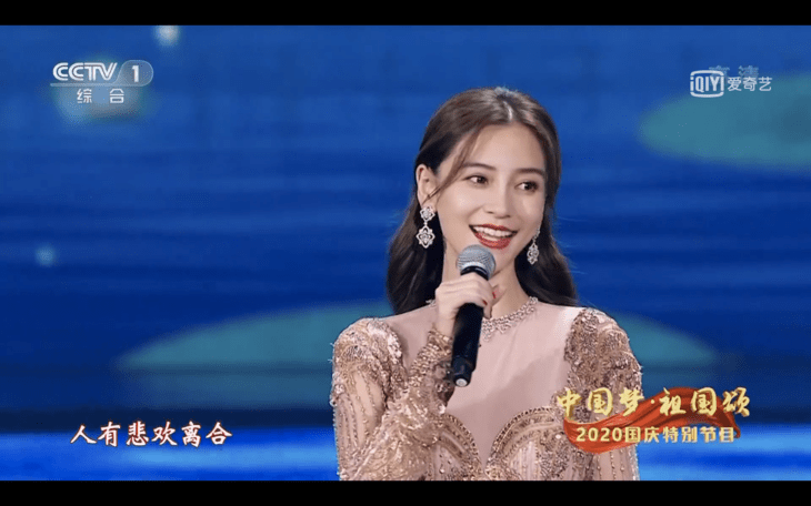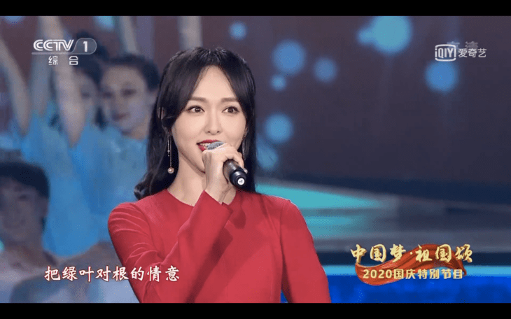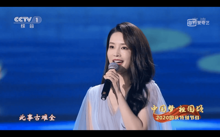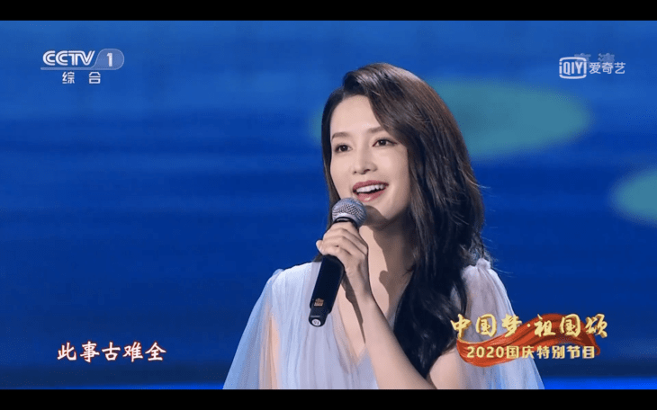 李沁穿着一身蓝色的拖地礼服出席了这次国庆晚会,远远看去,她身形挺拔,落落大方,跟她古典的气质极搭。