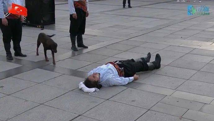 我又在哭,刚看到一个报道,说在土耳其的一个广场上,有一个演员饰演从马上摔下来的伤员,躺在地上不能动弹。