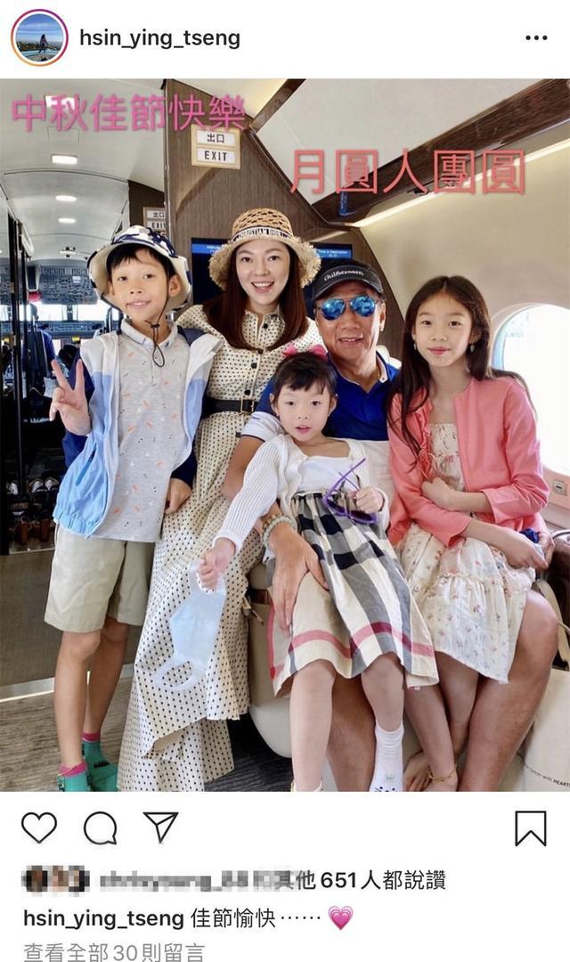 10月1日,富士康老板郭台铭的太太曾馨莹晒出一家五口合照。
