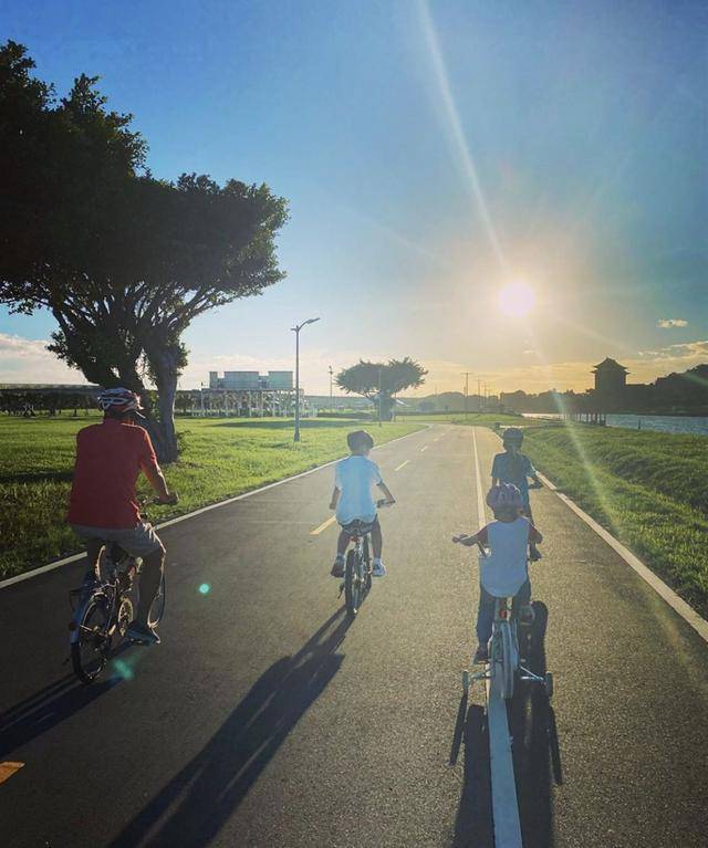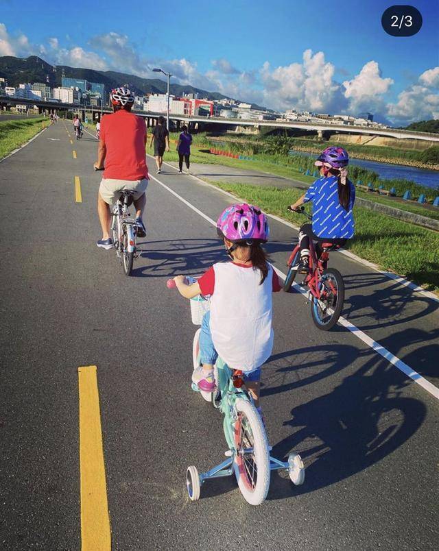 近日,曾馨莹就晒出一家人外出骑单车的照片: