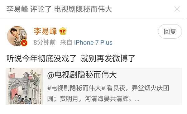 而且不仅仅是网友和观众,不久前,《隐秘而伟大》男主角李易峰更是在电视剧官博这条微博下亲自留言表示:“听说今年彻底没戏了 就别再发微博了”。
